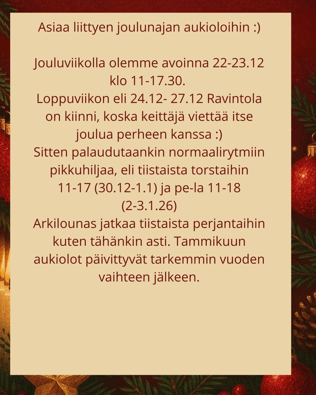 Arkilounas jatkaa marraskuussa tutulla aikataululla klo 11-14.30, mutta aukiolot iltojen osalta päivittyvät: olemme avoinna tiistaista torstaihin klo 11-17 sekä perjantaista lauantaihin klo 11-18